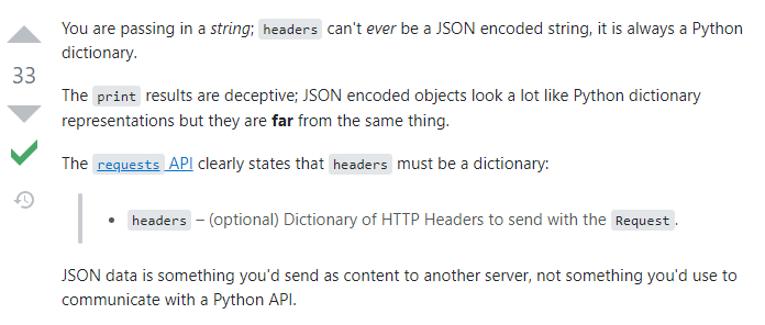 2. Header는 json으로 넣으면 안된다, dict형으로 넣으면 된다