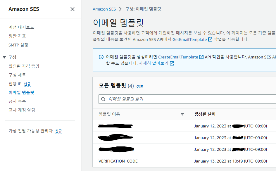 생성한 뒤 SES 홈페이지의 템플릿으로 들어가면 아래와 같이 확인할 수 있다.