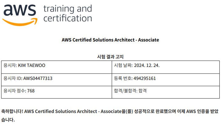 연말쯤에 갑자기 주변 팀원분들이 AWS Solutions Architect Associate 자격증을 따자고 제안하셨다. 예전에 업무를 보면서 AWS를 많이 다뤄봤기 때문에 어렵지 않게 딸 수 있을 거라고 생각했지만 귀찮아서 계속 미뤄왔는데 다같이 하는 김에 따면 좋겠다고 생각했다. 육아를 하는 와중이라 피로해서 많이 공부를 미뤘는데 이러다간 자격증을 못 딸 것 같아, 12월 초에 그냥 크리스마스 전날로 시험일자를 예약했다. 시험시간이 다가오니 돈이 아깝기도 하고 약속을 지키기 위해서라도 급하게 족보도 풀고 공부를 시작하게 됐다. 그래도 AWS를 해본 경험이 있어서 족보 위주로 공부를 했더니 일주일정도만에 금방 붙었다. 자격증이 자랑거리라고 생각하진 않지만 그래도 따고 나니 최소한의 증명정도는 되는 것 같아서 흠은 없는 것 같고, 붙고나니 다른 것들도 해볼 수 있겠는데? 라는 자신감이 생겨 올해에는 CKA나 같은 AWS MLS 자격증을 목표로 새로운 도전을 해볼까 한다.