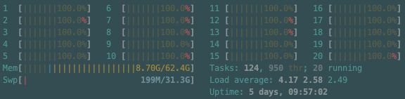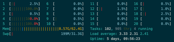 htop을 이용하여 cpu 사용량을 확인해본 결과 cpu가 불타오르는 것을 볼 수 있었다.