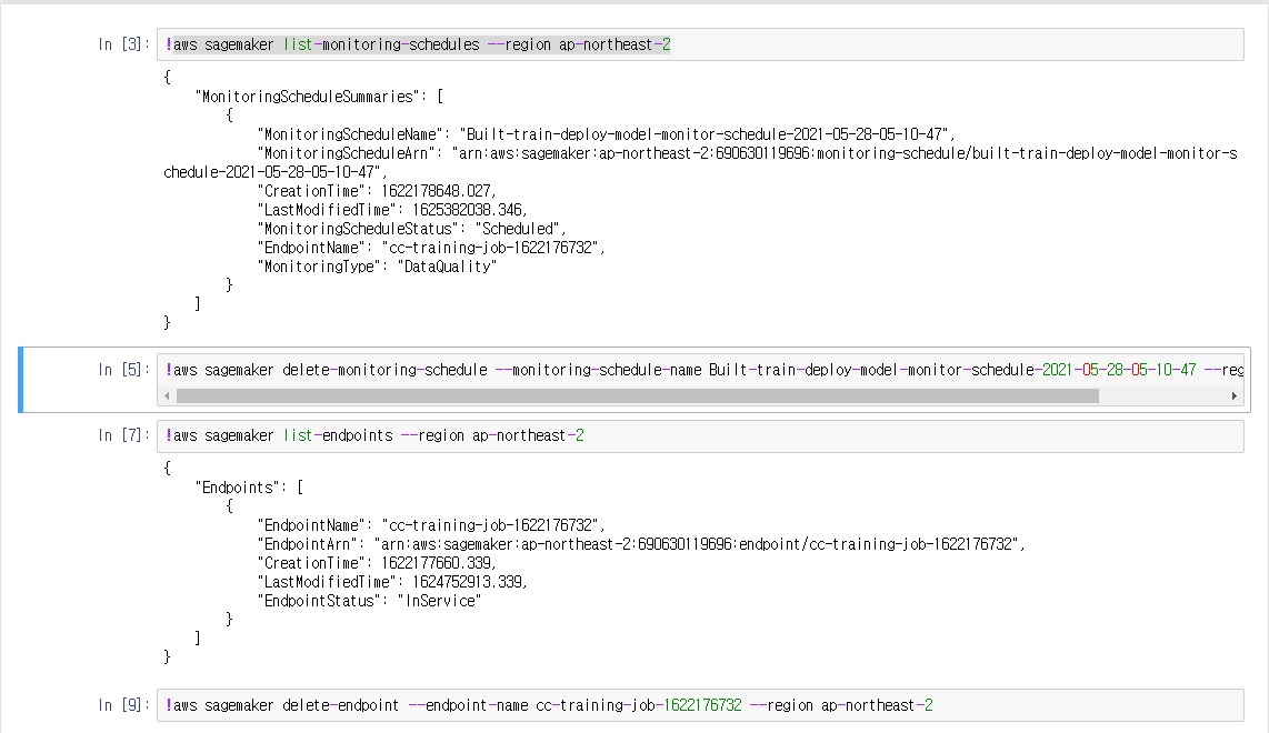 2. aws sagemaker delete-monitoring-schedule --monitoring-schedule-name Built<monitoring name> --region <region name>