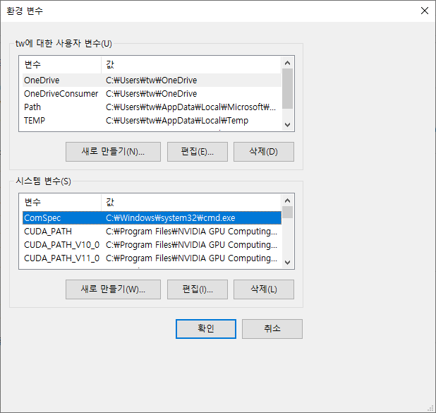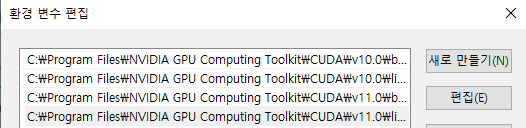 3) CUDA 설치 후, 고급 시스템 설정 -> 환경 변수를 통해 CUDA 설정을 확인한다.