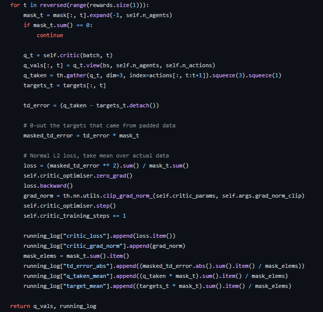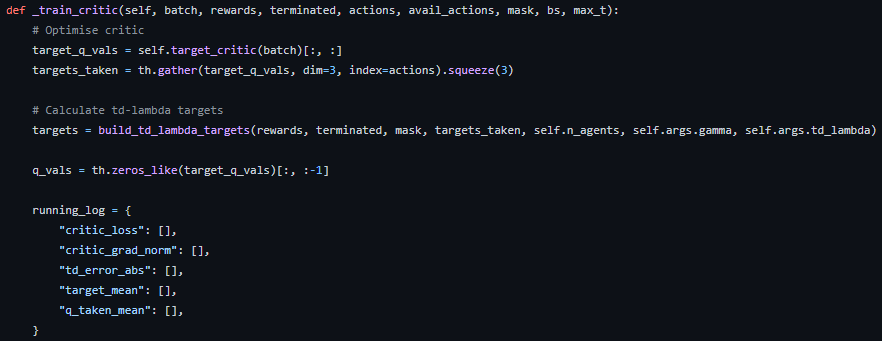 coma_learner.py의 train 함수를 잘 보면 _train_critic 함수가 있는데, 여기에서 critic에 대한 학습이 이루어진다.