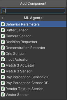 객체가 생성되면 화면 우측에 Add Component가 있는데, ML-Agent 설치가 잘 되었다면 우측 그림처럼 ML-Agent에서 지원하는 컴포넌트를 추가할 수 있다.