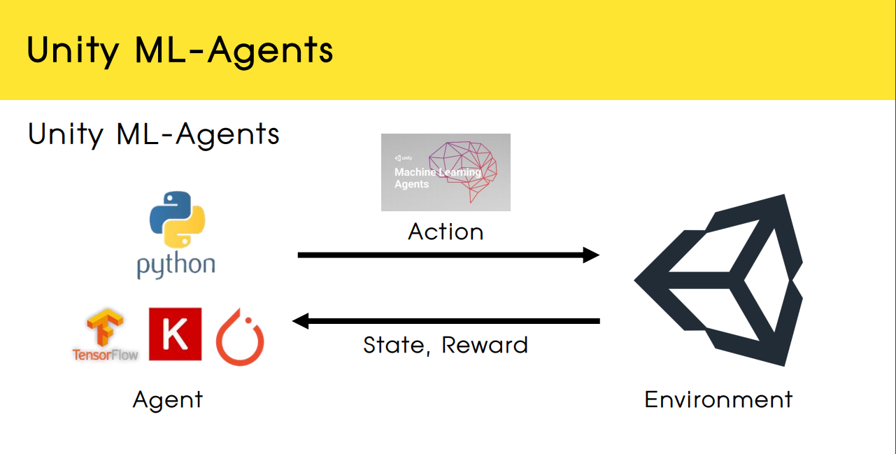 유니티의 ML-Agent 라이브러리와 python 딥러닝 라이브러리가 서로 통신하여 학습하는 구조