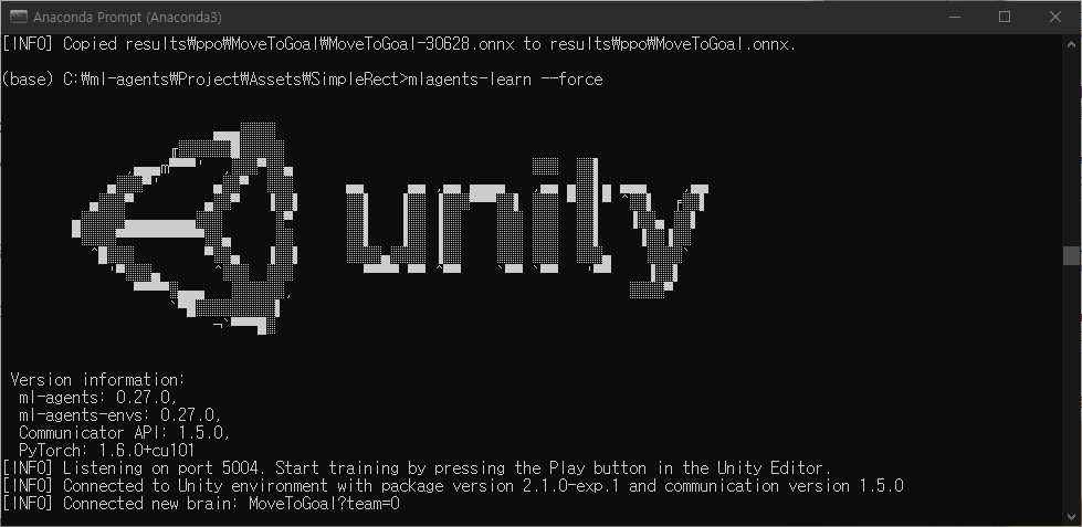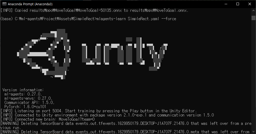 파이썬에서는 사실 간단하게 mlagents-learn 명령어로 하면 default로 설정된 모델로 실행되기 때문에