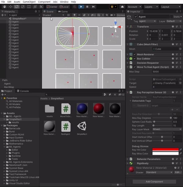 해당 객체 내부에 ActionBuffers가 추가되어 강화학습의 모델 결과를 출력받아 움직일 수 있게 된다.